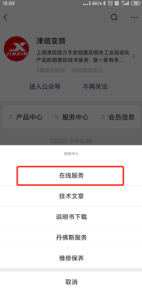 第一步,掃描二維碼,關(guān)注上海津信微信公眾號(hào),公眾號(hào)包括產(chǎn)品中心,服務(wù)中心和會(huì)員信息三個(gè)主菜單。