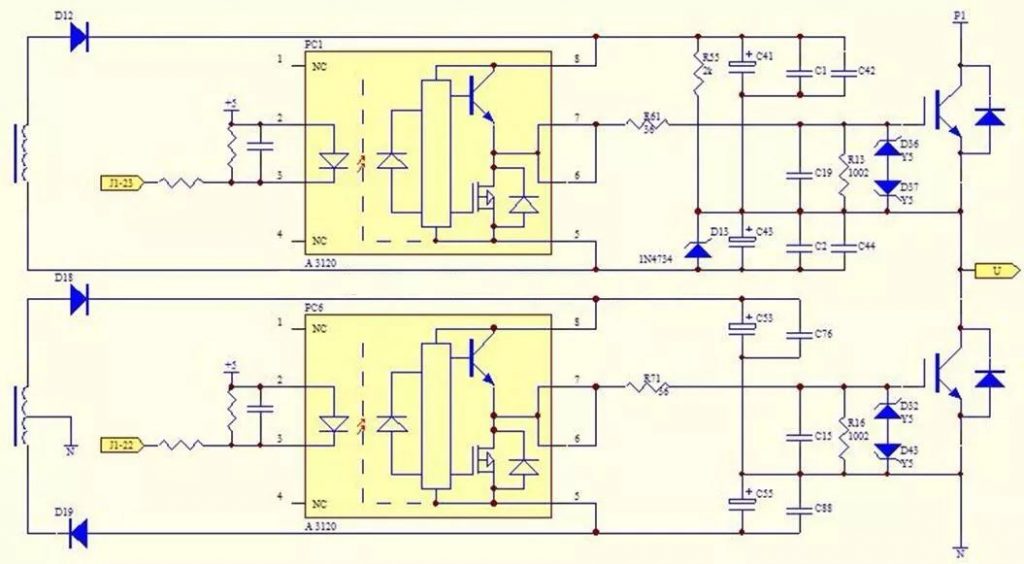 下臂的變壓器繞組有3個抽頭,中間抽頭與N相聯,和D18、D19、C53、C55一起構成下臂驅動電路的工作電源,以N為參考點,PC6的8、5腳電壓為+15V和-5V。