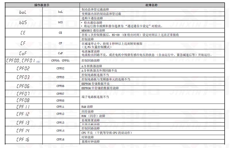| CPF01 | 操作器傳送錯(cuò)誤2 | 變頻器發(fā)生硬件故障 | 重啟變頻器,確認(rèn)故障是否持續(xù);若故障持續(xù)發(fā)生,則更換電路板或變頻器。關(guān)于主板更換,請(qǐng)向本公司代理商或銷(xiāo)售負(fù)責(zé)人垂詢(xún)。(注:為了清除故障,需要進(jìn)行故障復(fù)位操作;無(wú)法進(jìn)行故障跟蹤) |